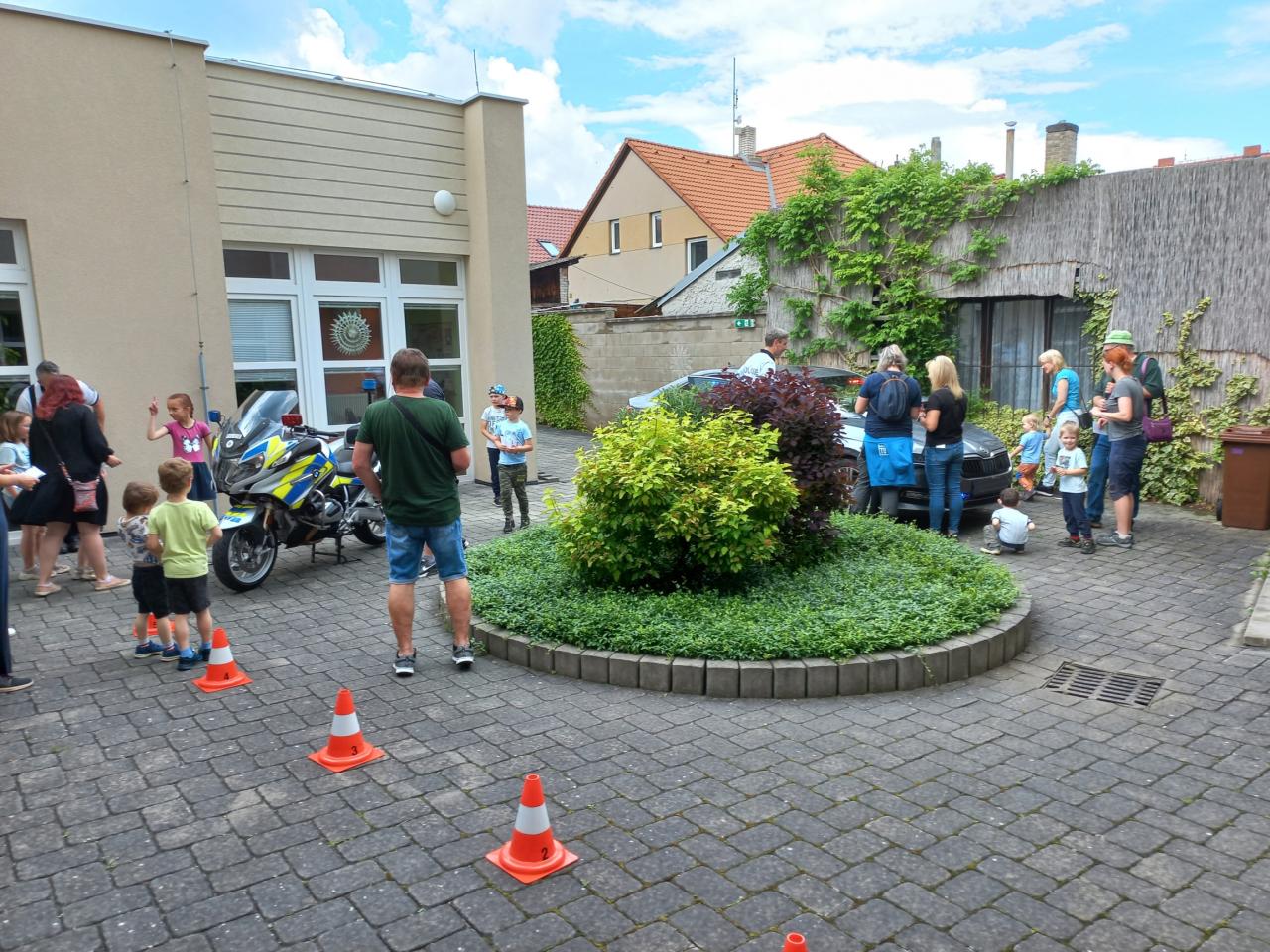 Velký zájem byl také o malování na obličej a tvarování zvířátek nebo předmětů dle přání dětí z balónků. V průběhu odpoledne pak následoval i hudebně animační program, při kterém si děti (a nejen ony) mohly zatančit, pobavit se, vyřádit se a zúčastnit se krátkých soutěží. Zajímavým a pozornost návštěvníků přitahujícím zpestřením celé akce byla přítomnost policistů z Dálničního oddělení PČR z Rudné, kteří přivezli ukázat policejní motorku a také policejní vůz Škoda Superb, který na nedaleké dálnici D5 provádí tzv. skrytý dohled. Děti i dospělí se mohli na motorku i do auta posadit a udělat si krásnou vzpomínku ve formě nevšední fotografie. Tímto bychom rádi Dálničnímu oddělení Rudná vyjádřili naše upřímné poděkování za jejich účast a zpestření Dětského dnu.