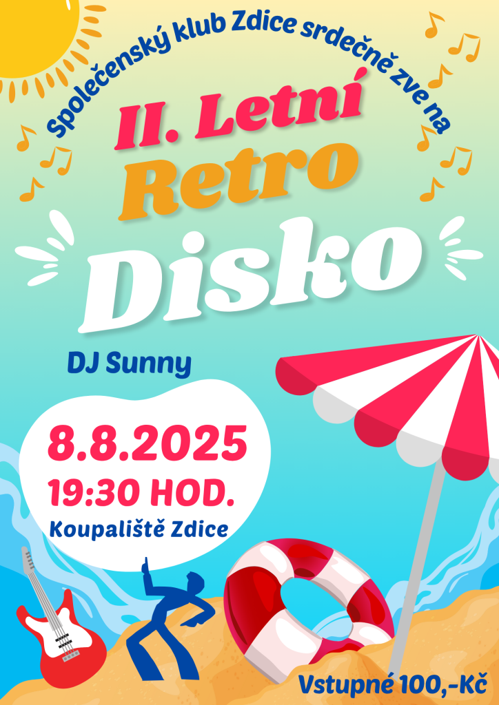 Společenský klub Zdice vás srdečně zve na diskopárty s DJ Sunny. Přijďte si užít skvělou hudbu a příjemnou atmosféru na koupaliště Zdice. Vstupné na akci je 100 Kč a začínáme v 19:30. Těšíme se na vaši návštěvu!